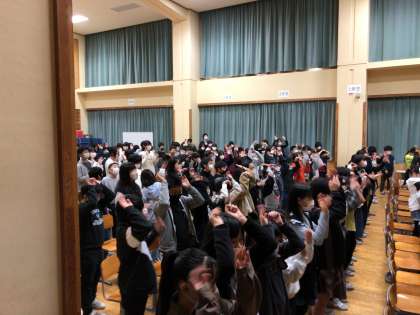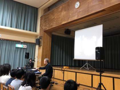 影絵鑑賞会の最初に、歌を歌いました。ジェスチャーを付けながら楽しく歌っている5年生でした。