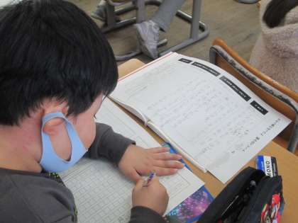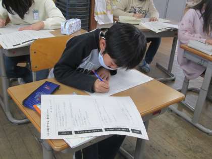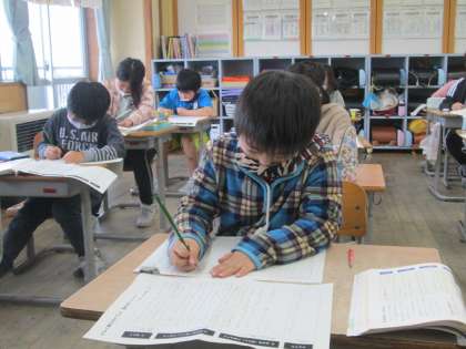 たからの地図を見ながら、物語をつくっています。「始め・出来事が起こる・出来事が解決する・むすび」の流れに沿って、組み立てを考えながら物語づくりに取り組みました。
