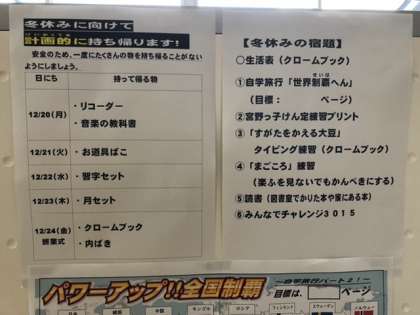 2学期もあと4日。校舎内には、2学期をきちんと終えて冬休みにつなぐ指導がされています。掲示物からも。