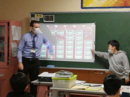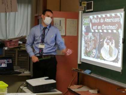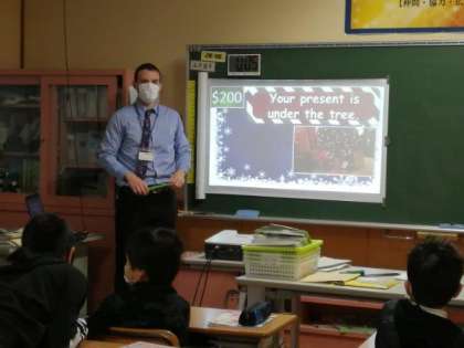 クリスマスを楽しみにしている子供たち。今日は、外国語科の学習で、クリスマスにまつわるクイズを楽しみました。選んだカードからクイズが出てくるALTの先生の仕掛けに、5年生はわくわくドキドキしていました。「あなたのプレゼントはどこにありますか?」「クリスマスツリーの下にあります。」クイズの問題と答えは、英語で書かれています。クイズをしながら、しっかり学習しています。