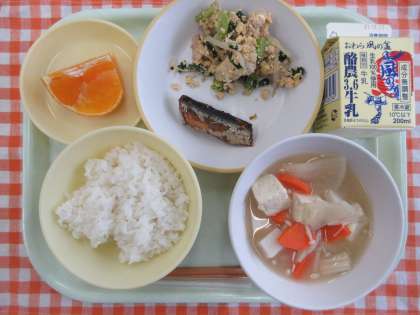 今日の献立は、ごはん、いわしの梅煮、卵とチンゲン菜の炒め物、いものこ汁、あいか、牛乳です。