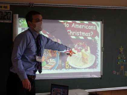 今日の外国語は、クリスマスにちなんだ英語のクイズをグループで協力して答えました。