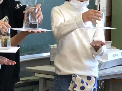科学実験の係の子供たちが取組の成果を見せてくれました。みんなから歓声が。