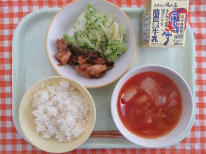 今日の献立は、ごはん、鶏肉とレバーのねぎソース、ゆでキャベツ、冬野菜のミネストローネ、牛乳です。