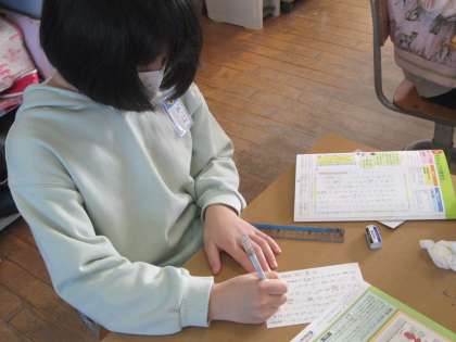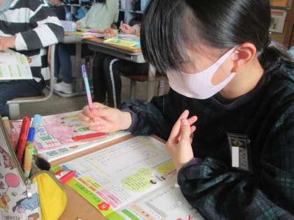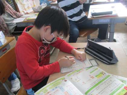 年賀状の書き方を学習しました。初めて自分で宛名の部分を書く児童もおり、授業の中で書き方を学んでいました。