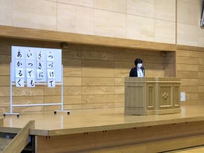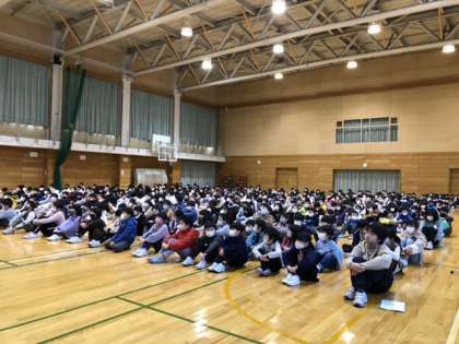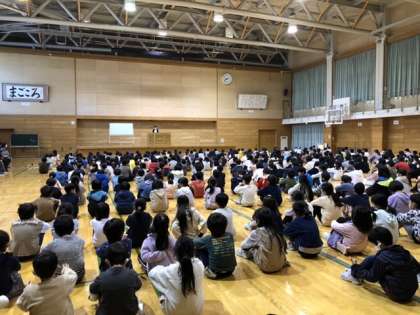 今回は全校児童が体育館に集まって式を行うことができました。校長先生のお話を真剣に聞いています。