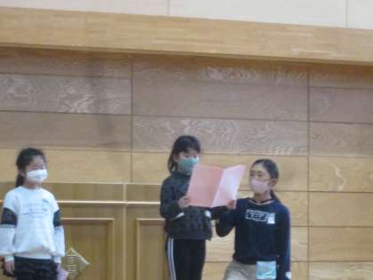 3年生代表として、3学期がんばりたいことを発表しました。全校児童の前で緊張していましたが、冬休みの間にも練習し、堂々と発表することができました。