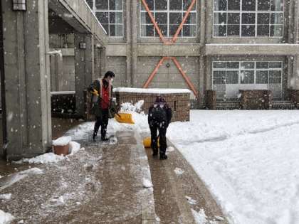 今朝も雪模様。玄関のタイルが滑りやすくなっていますので、職員で一仕事しています。間もなく子供たちが登校してきます。