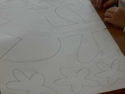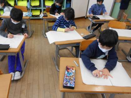 版画の下絵を考えました。シールを使って形を写すので、自分が表したい世界を想像し、下絵を完成させていました。素敵な作品になりそうです。