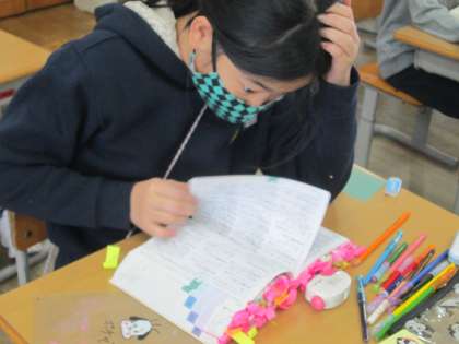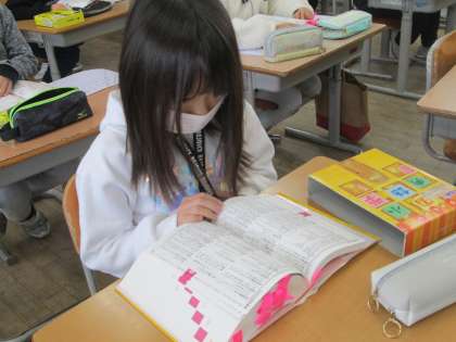 新しい漢字の学習をしました。その漢字が使われている熟語の意味を国語辞典で調べました。語彙も少しずつ増やしていきます。国語辞典に貼っている付箋の数もたくさんになってきました。