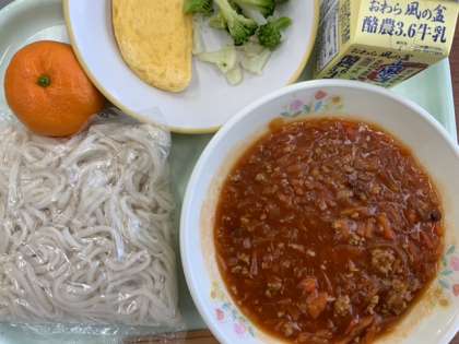 給食では、みじん切りにしたにんにく、玉ねぎ、にんじんとひき肉を炒めて、トマトを入れ、トマトケチャップ、ウスターソースで味をつけました。