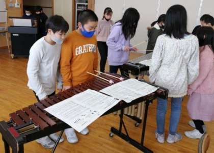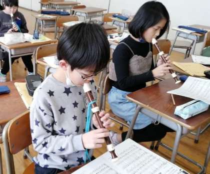 リコーダーの演奏をがんばってきた子供たち。今、いろいろな楽器の音のひびきを感じ取りながら演奏することに取り組んでいます。みんなで1つの曲を仕上げていくことの喜びや合奏の楽しさを感じ取ることができますように。