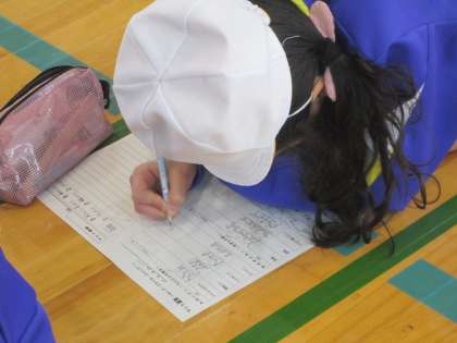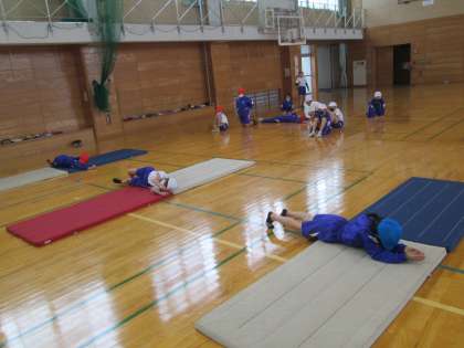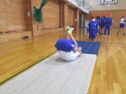 マット運動の学習をしています。今の自分ができる技のできばえをチェックしました。