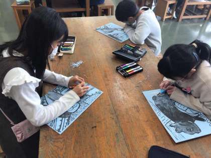彫刻刀を使って版画板を掘り進めていきました。終了時間を告げると「え、もう?!」「10分くらいに感じた!」など集中して掘り進めることができました。