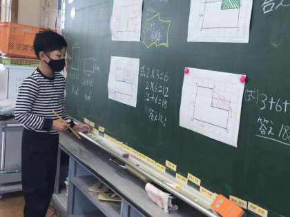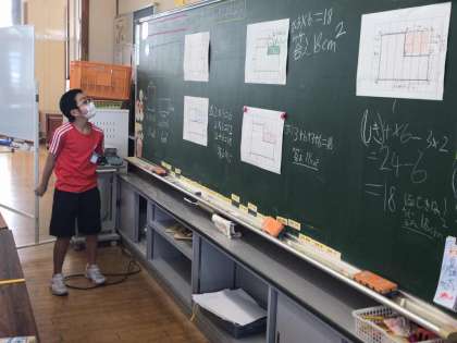 算数では、面積の求め方を考えました。たくさんの意見が活発に出ました。