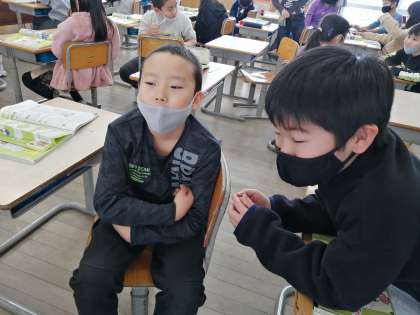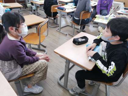 子供たちは、水が凍るときの様子を、これまでの学習や生活経験から、いろいろ想像しています。「水が凍ると、体積はどうなるだろう?」隣の友達やグループの友達と予想と、その根拠を伝え合っていました。