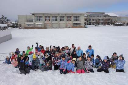 雪上で体を動かした後は、スキー山で集合写真を撮影しました。みんなたくさん体を動かし、ぽかぽかになったようです。