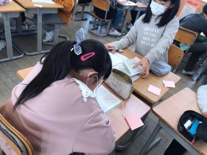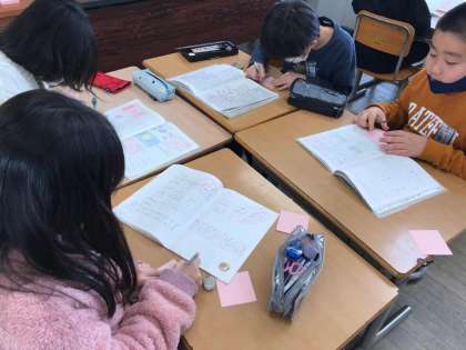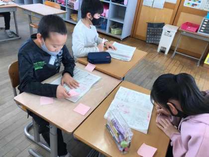 互いの自主学習ノートを見合い高め合います。友達の自学に付箋を貼っていきコメントを書いています。