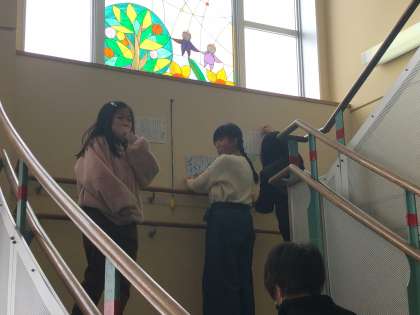 国語科の学習では、たくさんの詩の中からお気に入りの詩を選び、紹介する学習を終えました。仕上がった作品を、校舎内のいろいろな場所に行き、貼り付けました。自分のお気に入りを全校児童に広めます。