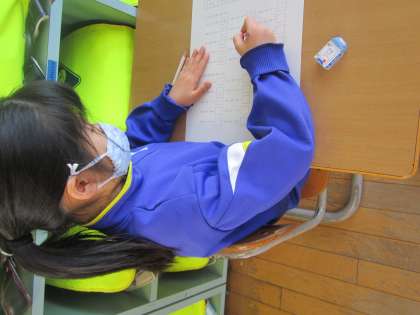 初めてのチャレンジテスト、集中して頑張っています!80点以上で合格ですが、100点を目指しています!
