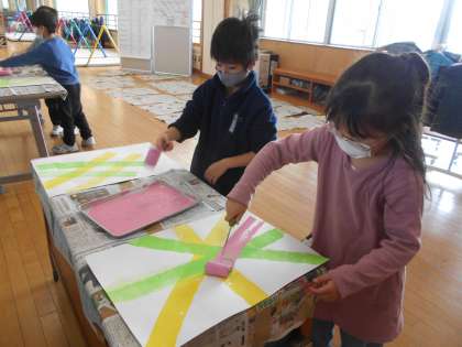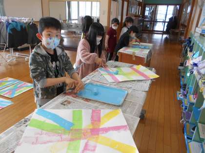 版画の台紙にローラーでピンクと水色の色を付けました。自分の作品のイメージを考えならつくりました。来週は、自分でつくったシールを貼る予定です。どんな作品ができあがるのか楽しみです。