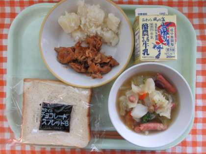 今日の献立は、食パン、ポークチョップ、ゆでポテト、百味ビーンズのポトフ、チョコレートクリーム、牛乳です。