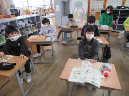 今日の外国語活動では、カードを使って一日の動きを英語で表す活動をしました。