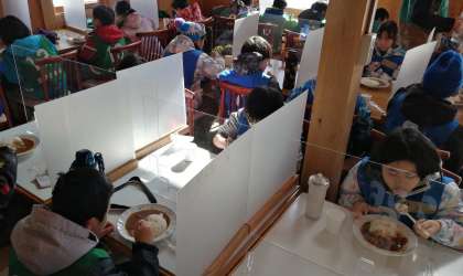 スキー教室のお昼ごはんは、カレーライスでした。消毒、アクリル板の設置、黙食等、感染防止対策もしっかり行われています。午前中の実習で疲れた子供たちは、美味しいカレーライスを食べて、元気を取り戻しました。