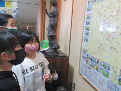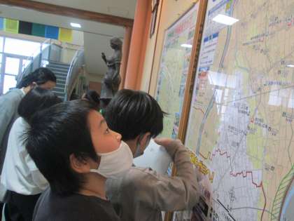 社会科でくらしを守るためにどんなことをしているのか学習しています。玄関に貼ってる大きな安全マップで、自分の地区の危険な場所を確認しました。