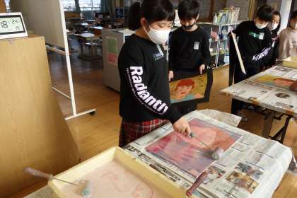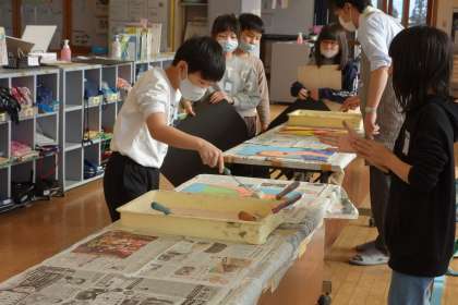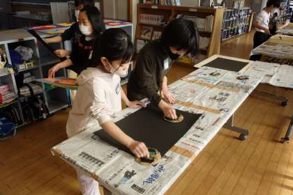 「下絵」「彫り」と丁寧に作業を進めてきた子供たち。作品が仕上がり、嬉しそうな子供たちでした。