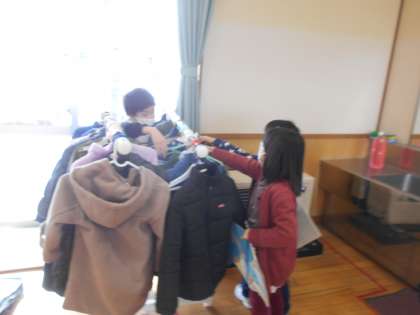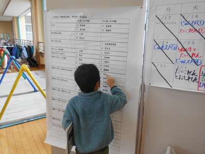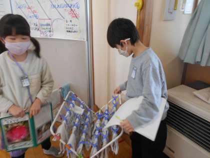 「かずさがしビンゴ」をしています。 10から90までの数をビンゴに書いてから、学校にあるいろりろなものを数えます。28このものがあったら、20の数字にまるを付けていくものです。子供たちはビンゴを目指して、雑巾やコート等いろいろなものを数えていました。