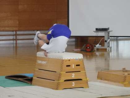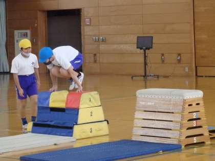 体育の跳び箱運動では、台上前転や足抜き跳びなどを練習したり、8段の高さに挑戦したりしました。今日は着地でしっかり止まることを意識して跳びました。