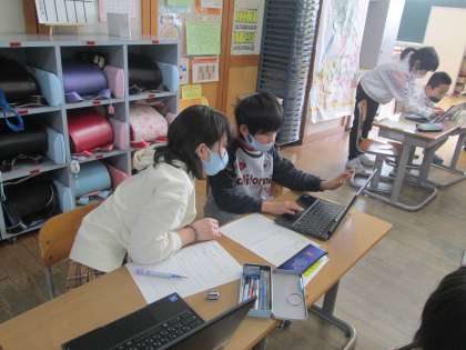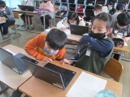 昔と今の宮野地区の航空写真を見比べて、土地の利用の変化を調べました。家や田んぼの数の増減、道路幅の違い等、いろいろな変化を見つけていました。