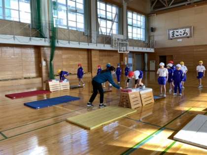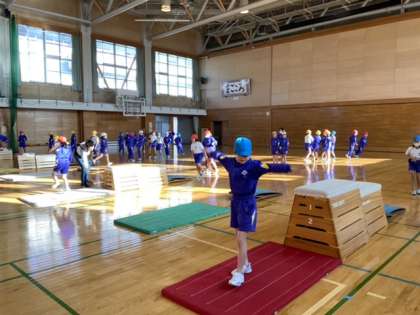 体育科では跳び箱に取り組んでいます。無理なく技能を高めていくために、今日は低い跳び箱を二つ繋いでやってみました。