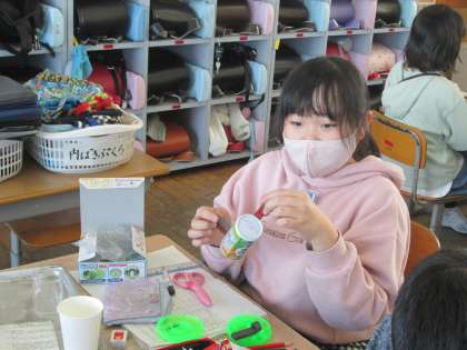 どんな物が磁石につくのか詳しく調べました。「明かりのときと一緒で、金属につくんじゃない?」との予想が多かったのですが、、、実験していると、「鉄のものしかつかない!」と自分たちで磁石の性質を見つけていました。