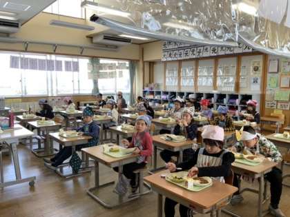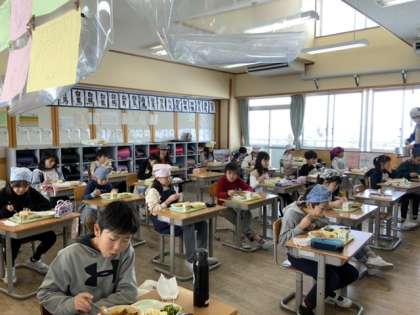 机の位置は授業時以上に距離を置き、いただきますをしてから食事の間の短時間だけマスクを外します。もちろん黙食です。
