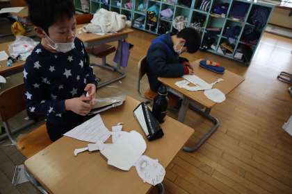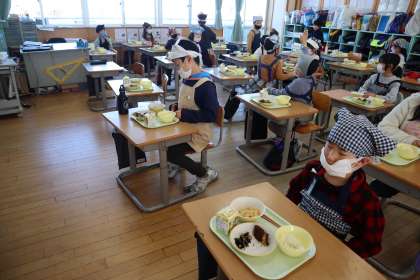 版画づくり、給食の時間の様子です。先生の話を聞いて、活動に取り組んでいました。