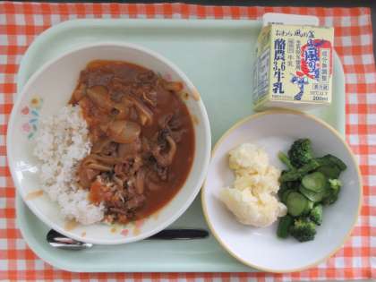 給食では、牛肉、しめじ、玉ネギをデミグラスソースとハヤシルウで煮込んでいます。