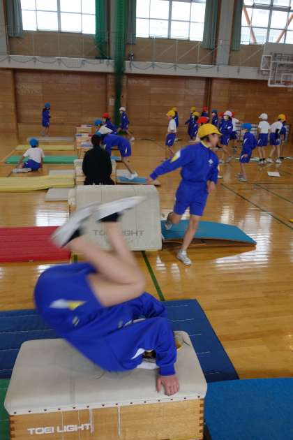 跳び箱運動の学習の様子です。難易度の高い技にもチャレンジする子供たちの姿が見られます。準備・後片付けもどんどん早くなってきています。さすが、3年生!