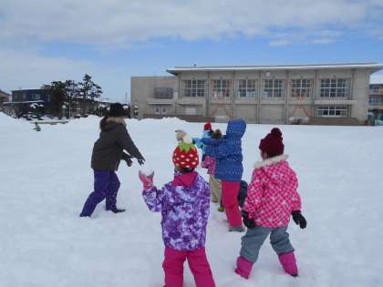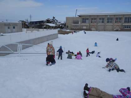雪が久しぶりに積もり、約1時間グラウンドで雪遊びをしました。スキー山から滑ったり、雪合戦をしたり、雪だるまをつくったりと思い思いに楽しんでいました。