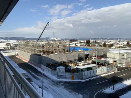 向かいの統合保育所の建設現場の様子です。少しずつ建物の形が明らかになってきています。