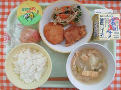 今日の献立は、ごはん、豚肉の竜田揚げ または エビカツ(選択)、ごまあえ、みそ汁、牛乳、はちみつレモンゼリー または いちごのシュークリーム(選択)