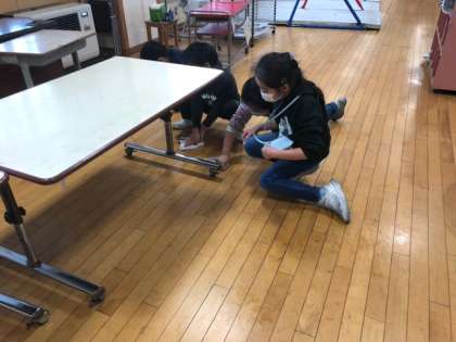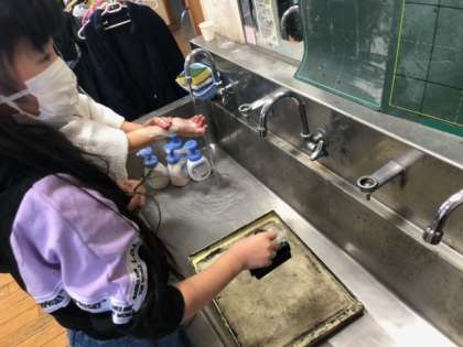 版画を刷った後は、汚れた床や道具を、子供たちで綺麗にしました。