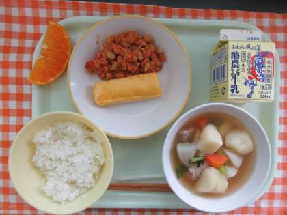 今日の献立は、ごはん、卵ロール、白いんげん豆のトマト味、野菜のスープ煮、甘平、牛乳です。
