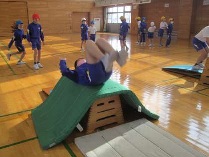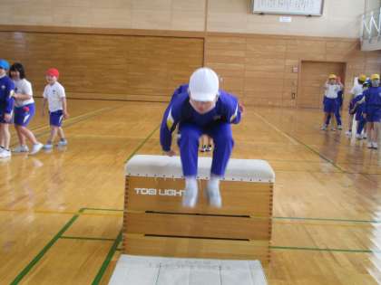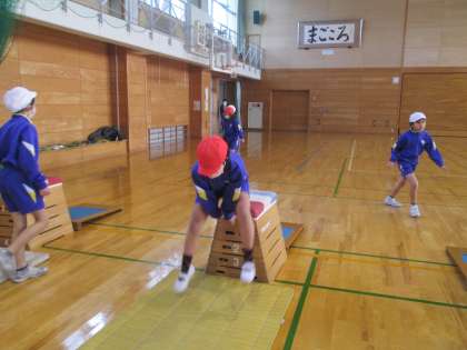 開脚跳び、抱え込み跳び、台上前転の3つの技にトライしています。