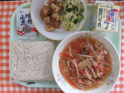 今日の献立は、ソフト麺の五目あん、ごまだれポテト、切り干し大根のドレッシング和え、味付け小魚、牛乳です。