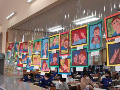 廊下に図工で作ったすてきな版画作品が掲示してあります。