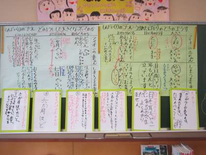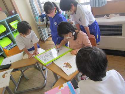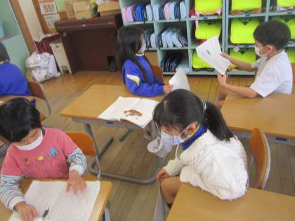 カンガルーの赤ちゃんの生まれたときの様子や育ち方は、ライオンの赤ちゃんととしまうまの赤ちゃんのどちらに似ているか考えました。体の大きさ、おちちを飲む期間、食べるものなどを比べながら、考えていました。
