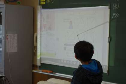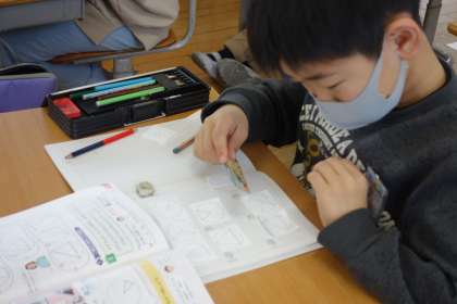 算数の学習の様子です。様々な三角形を仲間分けし、定規で確かめました。