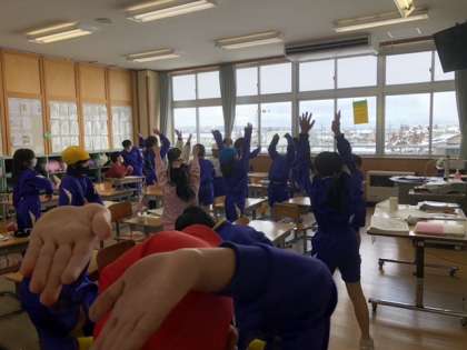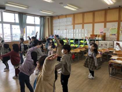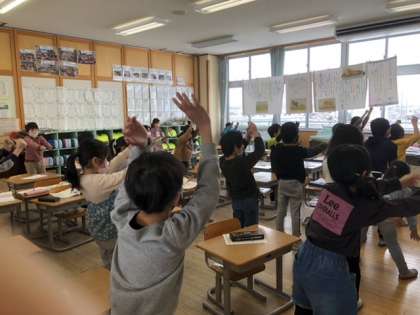 業間にできる手軽な運動を、ということで今日はラジオ体操をしています。楽しくできました。